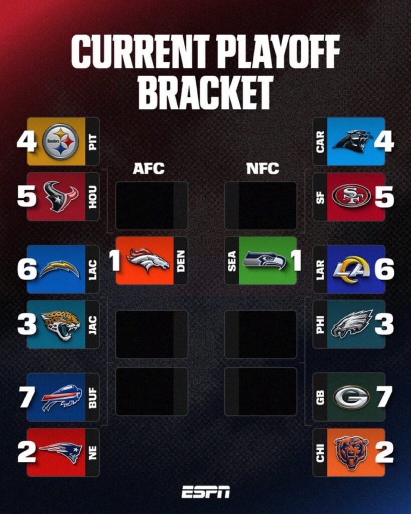Denver Broncos (13-3) β Already clinched the AFC West and currently hold the top seed. They control their destiny for home-field advantage throughout the playoffs. New England Patriots (13-3) β Locked into the postseason and AFC East champs. Still alive for the No. 1 seed depending on results. Jacksonville Jaguars (12-4) β Clinched a playoff spot; No. 1 seed still mathematically possible with help. Los Angeles Chargers (11-5) β In the playoffs; have chosen to rest QB Justin Herbert in Week 18 as they prepare for the postseason. Buffalo Bills (11-5) β Wild-card team locked in. Houston Texans (11-5) β Clinched a playoff berth; still in the AFC South race.