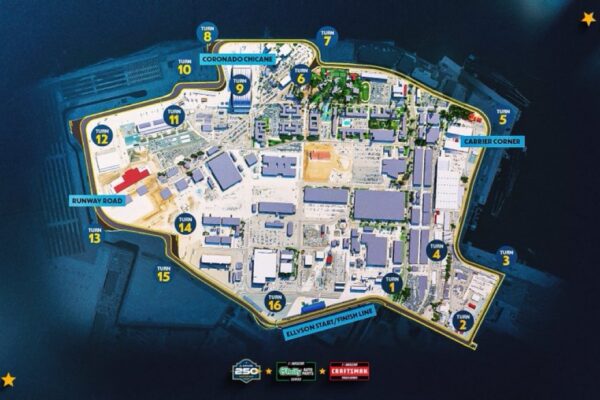 NASCAR just unveiled the Naval Base Coronado Street Course. 16 turns, 3.4 miles. Turn 5 is between the docking location of two aircraft carriers; Turn 14 is near the north end of a runway.
